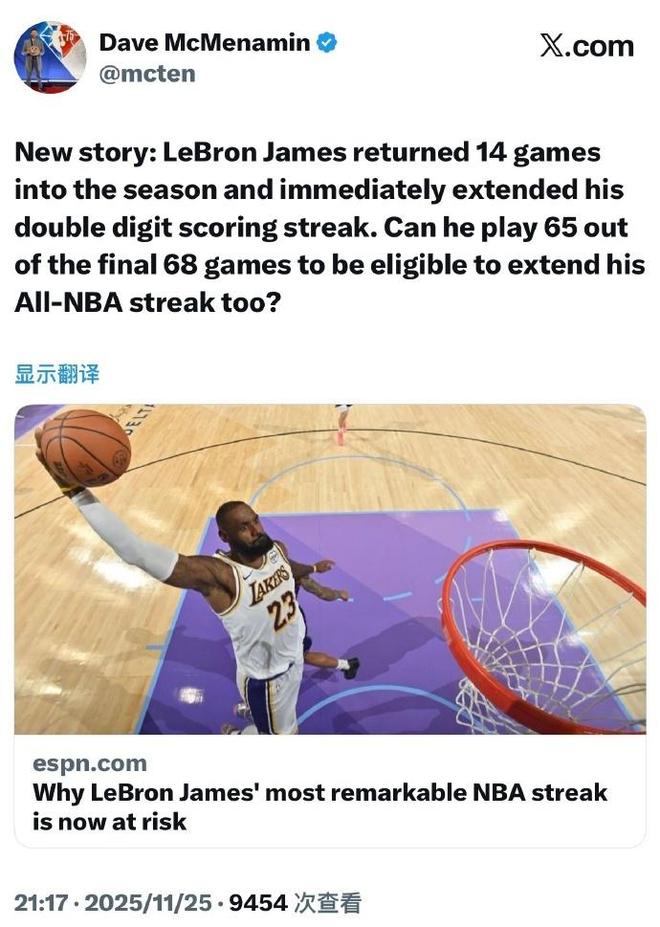 詹姆斯还有1个多月就年满41周岁,他是NBA现役最老的球员,而湖人剩余比赛还有11次背靠背比赛。 尽管詹姆斯已经连续21个赛季入选NBA最佳阵容,创造NBA历史最长纪录,但显然该纪录已经摇摇欲坠。