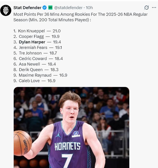 实际上本赛季新秀每36分钟得分,哈珀场均19.4分仅次于克努佩尔21分、弗拉格19.9分,只可惜哈珀的登场时间远不如前两人。 |