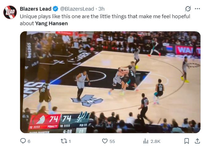 也有开拓者媒体认为杨瀚森在场上有闪光点,比如杨瀚森的掩护很夯实,直接帮助卡马拉挡出了一个空位三分球的机会。