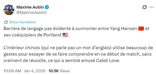 欧洲记者Maxime Aubin:杨瀚森与他开拓者队友之间的语言障碍急需解决,中国内线不会说英语,登场后与队友用手语沟通可根本不成功,他的手语让凯勒布-乐福觉得好笑。