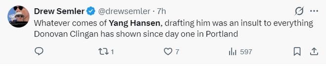 但美记德鲁-斯梅尔炮轰小杨:不管杨瀚森最终发展成什么样,开拓者选他纳入球队的轮换就是对克林根的不尊重,克林根的表现比杨瀚森出色很多。