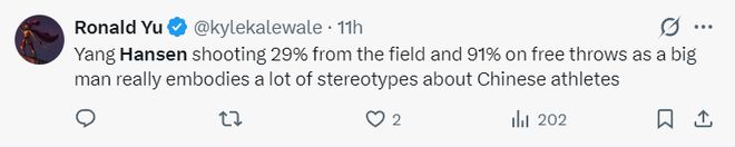 美媒RY:杨瀚森本赛季投篮命中率只有29%,而他的罚球命中率达到92%,作为一名7尺内线,他确实体现了很多中国运动员的刻板印象。