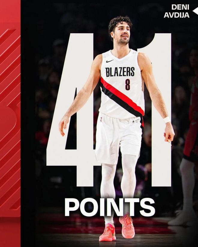 拿上一场比赛来说,开拓者主场103-102险胜火箭,这场阿夫迪亚交出生涯之夜:全场出战39分钟,投篮24中13,三分9中2,罚球15中13,拿下41分6篮板2助攻1抢断。 这场开拓者赢得并不容易,阿夫迪亚在前三节就拿下32分,第四节又包揽了全队最后10分中的8分,而且这8分都非常强硬,全部是2+1(第三次罚球没进)。 41分对于很多球星都不少见,但对于阿夫迪亚可太罕见了,这仅仅是他生涯第二次拿下40+,上一次还是在两年前,当时他还在奇才效力,输给鹈鹕的比赛里,阿夫迪亚投篮24中13、三分10中6、罚球13中11,空砍43分15篮板3助攻。