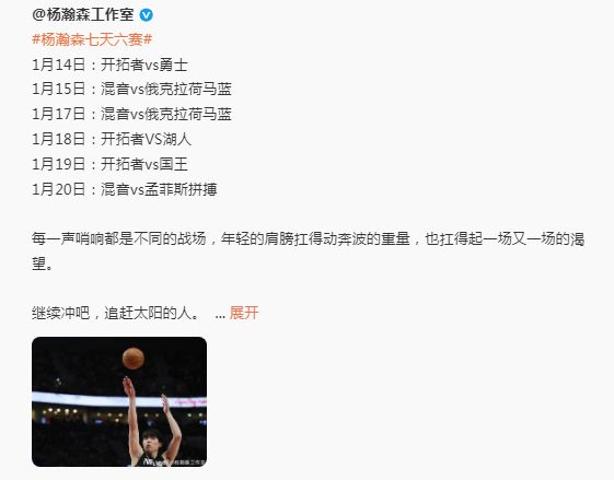 杨瀚森近期连续在开拓者与发展联盟下属球队混音队征战,他在7天之内参加了3场NBA比赛,以及3场发展联盟比赛,尤其是最近4天连续有比赛。 杨瀚森工作室盛赞杨瀚森7天6战的表现: 1月14日:开拓者vs勇士:3分2篮板1助攻 1月15日:混音vs俄克拉荷马蓝:22分7篮板3助攻1抢断2盖帽 1月17日:混音vs俄克拉荷马蓝:14分17篮板2助攻2盖帽 1月18日:开拓者vs湖人:0分0篮板0助攻0抢断0盖帽 1月19日:开拓者vs国王:2分1助攻1抢断 1月20日:混音vs孟菲斯拼搏:19分5篮板1助攻1抢断1盖帽8失误4犯规