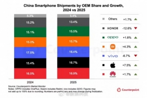 体育资讯1月19日讯 Counterpoint Research 在今日发布的新闻稿中表示,中国智能手机市场 2025 年第四季度出货量同比减少 1.6%,而 2025 年全年的出货则减少了 0.5%。 凭借 iPhone 17 系列的强劲表现和产能加速爬坡,苹果以 21.8% 收获 2025Q4 中国智能手机市场占比第一,不过 iPhone Air 仅贡献了苹果整体销量的不足一成;而 2025 全年的市占冠军则归属拿下 16.9% 的华为。 Counterpoint 表示,由于 DRAM 内存价格在今年 Q1、Q2 将进一步上涨 40~50% 和 20%,各大市场参与者将优化产品组合,缩减低端机型以保障利润率。尽管新一轮的国家补贴将在一定程度上缓解行业整体的成本压力,这家机构对智能手机市场的整体前景仍持谨慎态度。 |