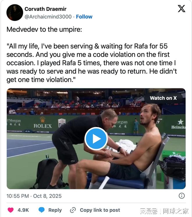 梅德韦杰夫在上海大师赛第四轮中,上演了一场戏剧性的胜利。这位29岁的俄罗斯球员在第二盘末段经历了抽筋的困扰,但他成功恢复,最终以7-6(6) 6-7(1) 6-4战胜了美国选手勒纳·钱。在这场比赛中,梅德韦杰夫表现出顽强的拼搏精神,尽管在八天前他因抽筋在北京中网的半决赛中因伤退赛,未能完成决胜盘的较量。但这一次,梅德韦杰夫成功克服了身体上的困境,发起了强势反击,最终获得了胜利。 “我认为最艰难的部分是我们之前打过两次,而且在我看来,他是一个令人难以置信的球员,因为他的发球并不好,而发球在网球中非常重要。”梅德韦杰夫说道,“没有发球,他才19岁,世界排名三十多位,而且还在不断上升。在我看来,他是一个非常出色的网球选手。” “他对比赛的感觉非常好。现在有很多球员每一球都打得非常强劲,并且拥有出色的发球,这让他们能在比赛中保持竞争力。而他没有这些优势,却依然能够打得非常好。对我来说,能够击败他……我当时以为我会输的。我又开始抽筋了,能扭转局面我真的超级开心。” 不过,梅德韦杰夫再次卷入争议,这一次是在2025年上海大师赛上,他因对主裁拉亚尼爆发情绪而登上头条。这位俄罗斯球员甚至在怒火中提到了已经退役的纳达尔,以此发泄对自己被判违规的不满。 梅德韦杰夫在周三的四分之一决赛中对阵美国新星勒纳·钱,这是两人本赛季的第三次交手。在前两次交锋中,美国人都笑到了最后,让梅德韦杰夫在心理上背负了沉重的包袱。 这场比赛开局不错,梅德韦杰夫抢七赢下首盘,并在第二盘早早取得3-0领先。然而,他再次被之前失利的阴影笼罩,前世界第一被破发追平比分,第二盘又一次进入抢七。 这一次,勒纳抓住机会,在小分中率先取得优势。就在这时,梅德韦杰夫情绪失控,怒吼主裁拉亚尼。拉亚尼认为他在接发球时拖延太久,而勒纳已经准备好发球。 在被判违规后,梅德韦杰夫当场反击,提起自己与纳达尔交手的往事。他认为纳达尔在比赛中总是让对手等待,但从未因此受到处罚,而他却在上海第一次就被判违规。他当面指责主裁“疯了”,对判罚极为不满。 梅德韦杰夫愤怒地说道:“我一辈子发球时都在等拉法,他每次都要55秒,而你今天第一次就给我判了违规。我和拉法打了5次,没有一次是我准备好发球而他已经准备好接发的。他从来没有被判过一次违规。而你今天一点点的事就罚我。我一直在等他接球,你从来没罚过他。你疯了,完全疯了。” 尽管如此,梅德韦杰夫还是输掉了第二盘,但他在决胜盘以6-4逆转取胜,成功晋级上海大师赛八强。 击败勒纳后,梅德韦杰夫将在八强赛迎战澳大利亚选手德米纳尔。后者在16强战中击败博尔赫斯,目前在本届比赛中尚未丢掉一盘。 若梅德韦杰夫战胜德米纳尔,他将在半决赛中迎战阿利亚西姆或林德克内希,而决赛中他可能再度遭遇德约科维奇。(来源:网球之家 作者:火花) |