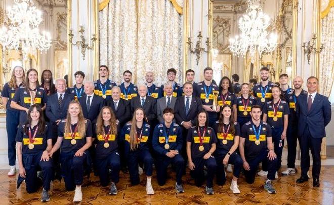 马塔雷拉总统表示:你们的表现非常出色,并受到了所有球迷的热切关注。谢谢你们。 总理乔治娅-梅洛尼说道:你们带给了我们非凡的情感体验,感谢你们让意大利的颜色站上世界之巅。 意大利奥委会主席 :我们将继续努力,以期再次回到这里。这是一项非凡的成就。这些成果是深入、持续且共同工作的结果。体育的成功不仅仅由奖牌衡量,更在于我们留下了什么。