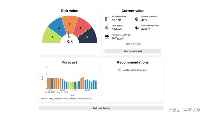 根据各设备的不同功能,这个感应器搜集的实时数据包括:气温、 湿度、风速、热辐射值、空气质量。 气温和湿度是影响体感温度最关键的两个指标,单纯的高温其实并没有想象得那么可怕,高温伴随着高湿才是最可怕的。比如,今年澳网的气温比去年上海大师赛要高不少,但湿度要低很多,这导致人们的体感温度并没有想象的那么高。因为湿度越大,皮肤就更难散热。 此外,风速对体感温度也很重要,适度的风速可以加快空气流动,便于汗水挥发,从而及时带走皮肤上的热量。而热辐射值则包括直射阳光和周围看台、建筑、地面反射的热量,这种热辐射带来的感觉在我们方言里被称为“蒸人”,也就是热浪滚滚的意思。